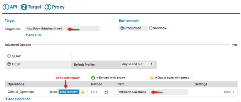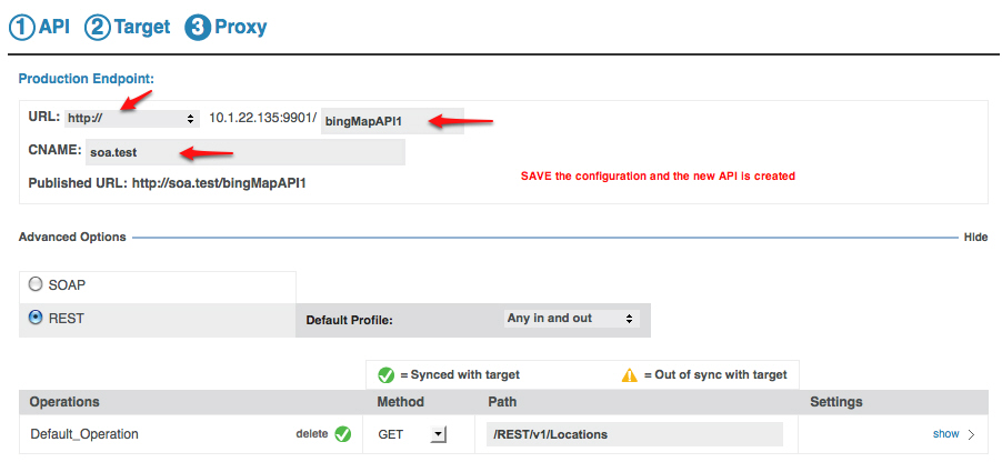 By default, the REST protocol is selected for your API, a Default Profile (Any in and out), and Default Operation are specified. After specifying the Target URL and Environment, you can optionally update the existing protocol (REST), or change the protocol to SOAP in the Advanced Options section.